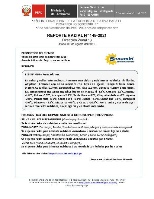 SENAMHI-DZ13 Puno: Reporte radial del 03 de agosto del 2021