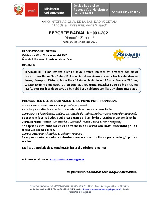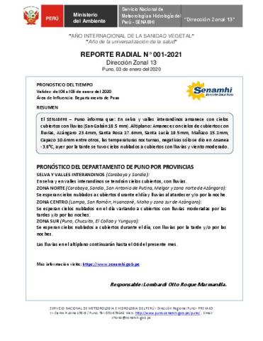 SENAMHI-DZ13 Puno: Reporte radial de 03 de enero el 2021