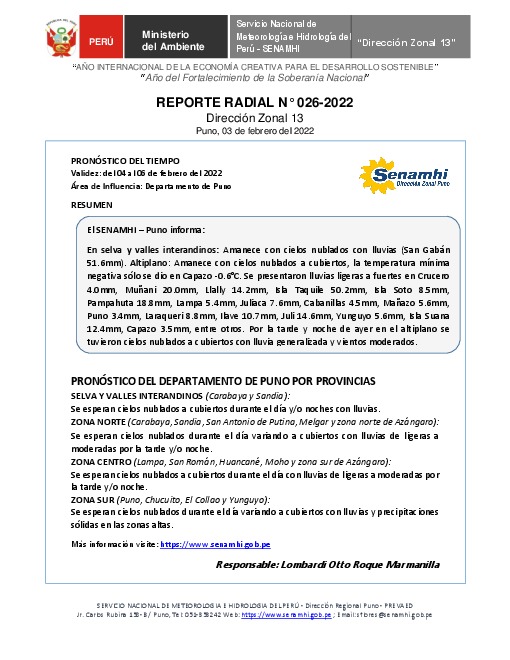 SENAMHI-DZ13 Puno: Reporte radial del 03 de febrero del 2022