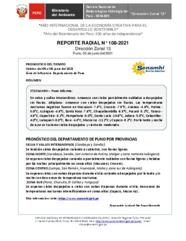 SENAMHI-DZ13 Puno: Reporte radial del 03 de junio del 2021