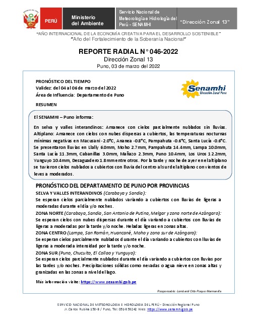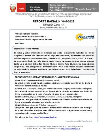 SENAMHI-DZ13 Puno: Reporte radial del 03 de marzo del 2022