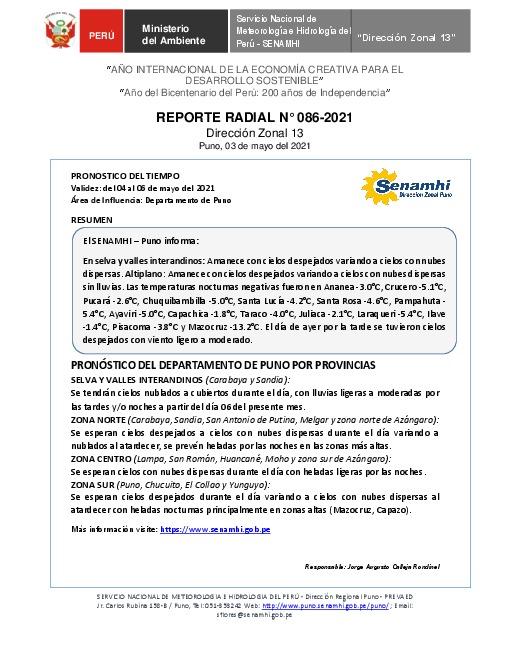 SENAMHI-DZ13 Puno: Reporte radial de 03 de mayo del 2021