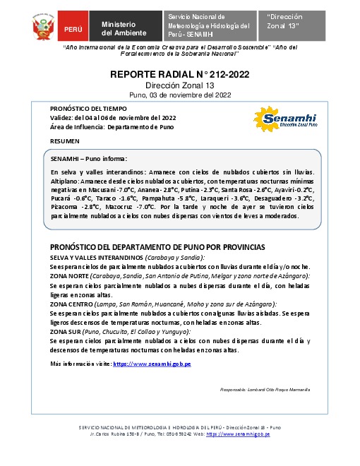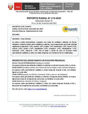 SENAMHI-DZ13 Puno: Reporte radial del 03 de noviembre del 2022
