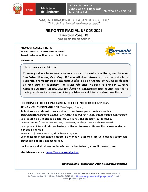 SENAMHI-DZ13 Puno: Reporte radial de 04 de febrero del 2021