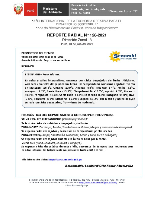 SENAMHI-DZ13 Puno: Reporte radial del 04 de julio del 2021