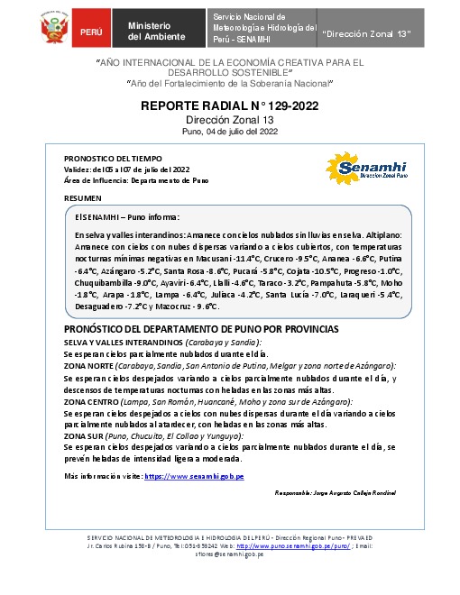 SENAMHI-DZ13 Puno: Reporte radial de 04 de julio del 2022
