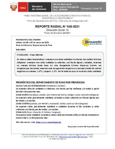 SENAMHI-DZ13 Puno: Reporte radial del 04 de marzo del 2021