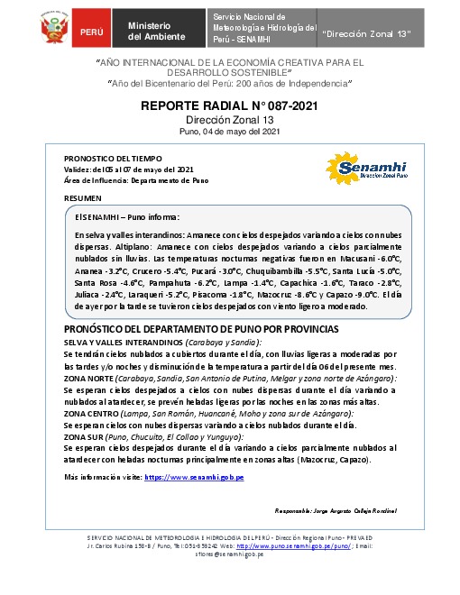 SENAMHI-DZ13 Puno: Reporte radial de 04 de mayo del 2021