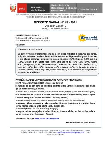 SENAMHI-DZ13 Puno: Reporte radial del 04 de octubre del 2021