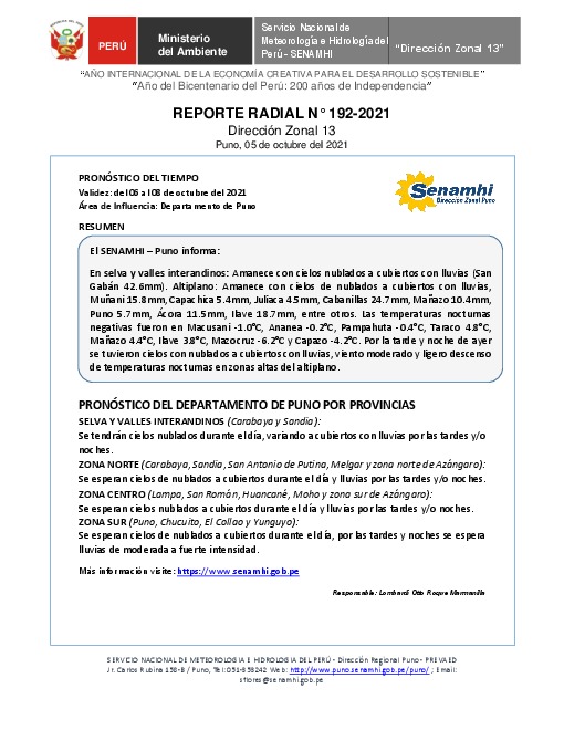SENAMHI-DZ13 Puno: Reporte radial del 05 de octubre del 2021