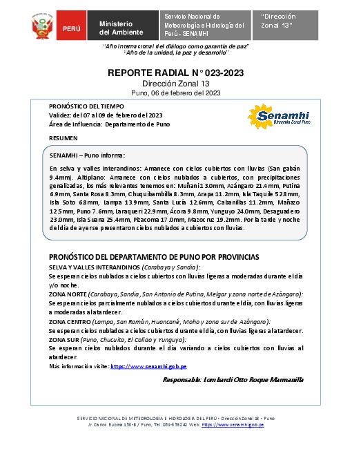 SENAMHI-DZ13 Puno: Reporte radial del 06 de febrero del 2023