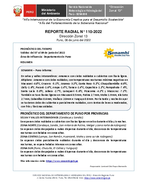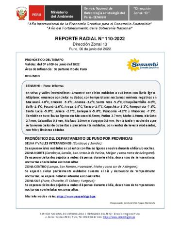 SENAMHI-DZ13 Puno: Reporte radial del 06 de junio del 2022