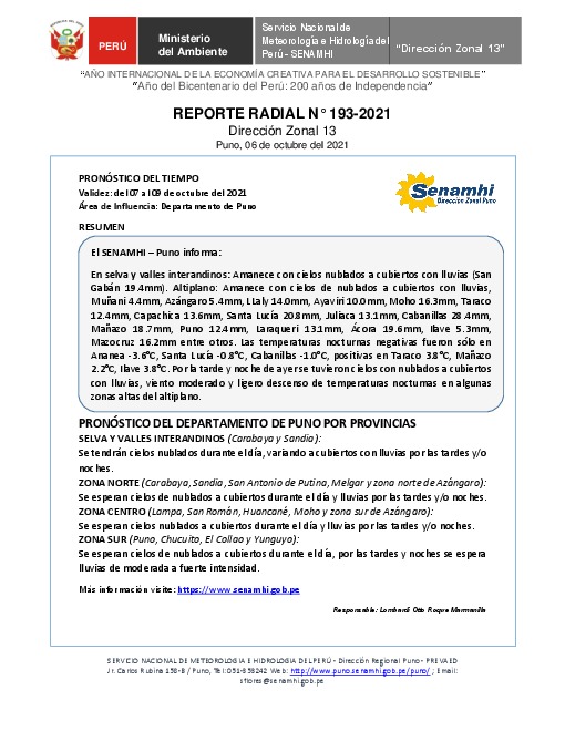SENAMHI-DZ13 Puno: Reporte radial del 06 de octubre del 2021