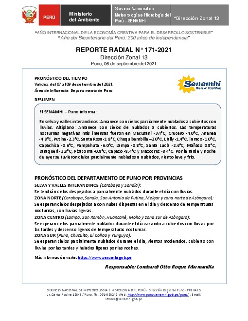 SENAMHI-DZ13 Puno: Reporte radial del 06 de septiembre del 2021