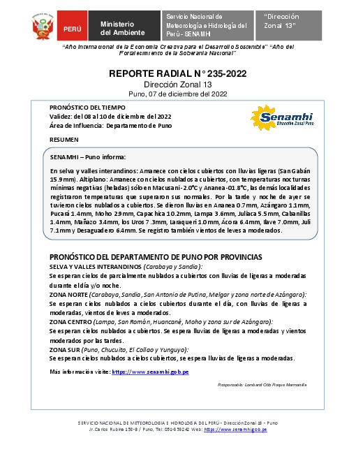 SENAMHI-DZ13 Puno: Reporte radial del 07 de diciembre del 2022