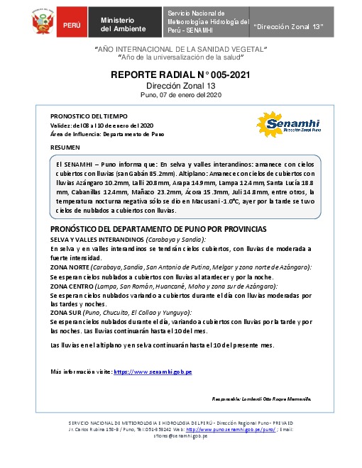 SENAMHI-DZ13 Puno: Reporte radial de 07 de enero del 2021