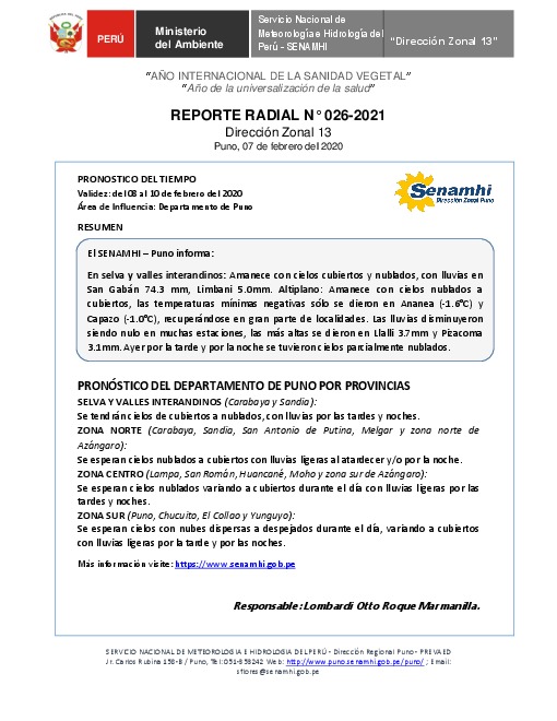 SENAMHI-DZ13 Puno: Reporte radial de 07 de febrero del 2021