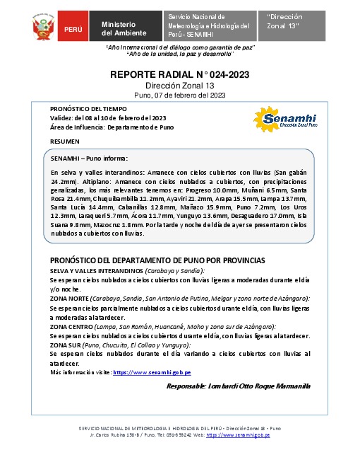 SENAMHI-DZ13 Puno: Reporte radial del 07 de febrero del 2023