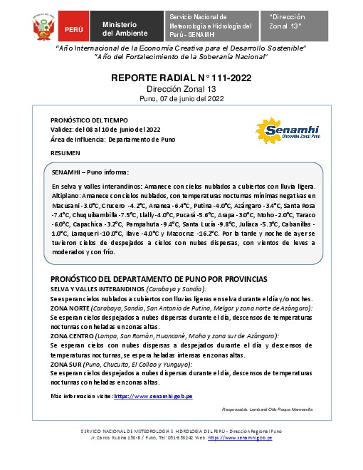 SENAMHI-DZ13 Puno: Reporte radial del 07 de junio del 2022