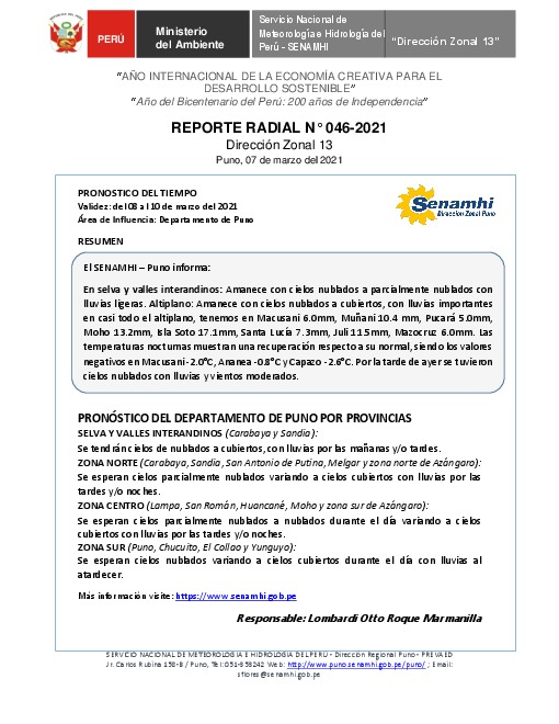 SENAMHI-DZ13 Puno: Reporte radial del 07 de marzo del 2021