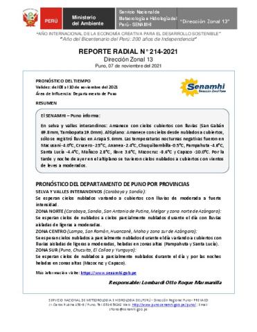 SENAMHI-DZ13 Puno: Reporte radial del 07 de noviembre del 2021