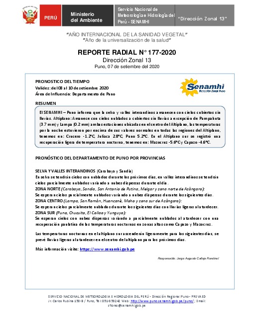 SENAMHI-DZ13 Puno: Reporte radial del 07 de setiembre del 2020