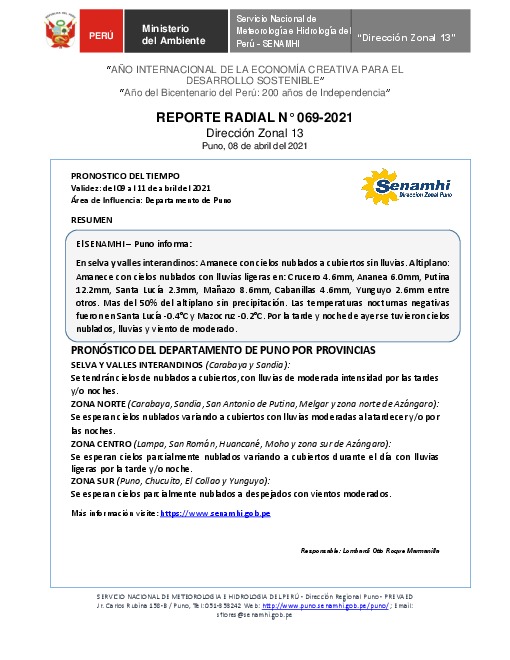 SENAMHI-DZ13 Puno: Reporte radial del 08 de abril del 2021