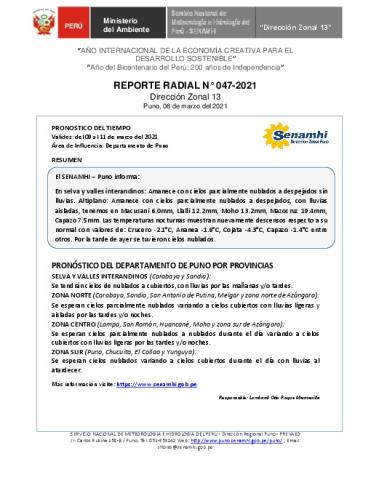 SENAMHI-DZ13 Puno: Reporte radial del 08 de marzo del 2021
