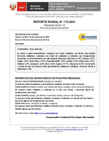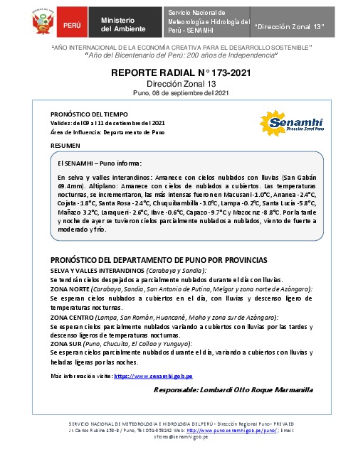SENAMHI-DZ13 Puno: Reporte radial del 08 de septiembre del 2021