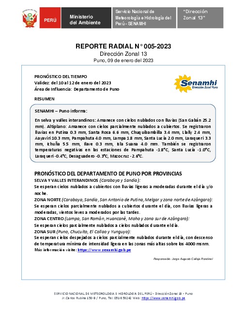 SENAMHI-DZ13 Puno: Reporte radial del 09 de enero del 2022