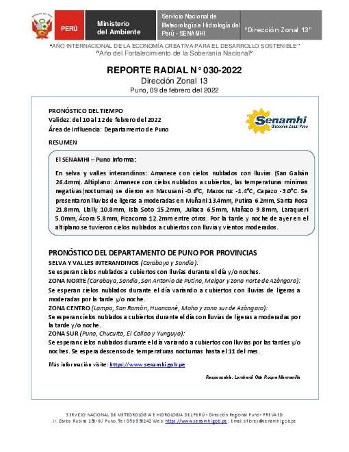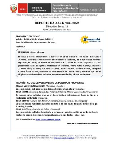 SENAMHI-DZ13 Puno: Reporte radial del 09 de febrero del 2022