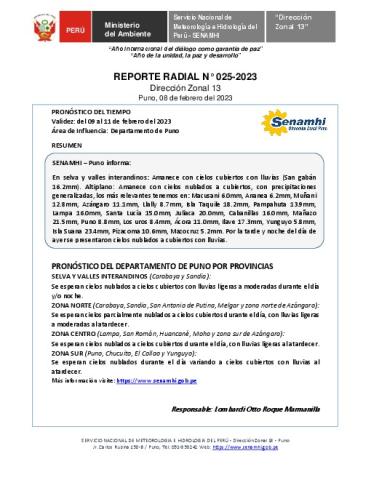 SENAMHI-DZ13 Puno: Reporte radial del 09 de febrero del 2023