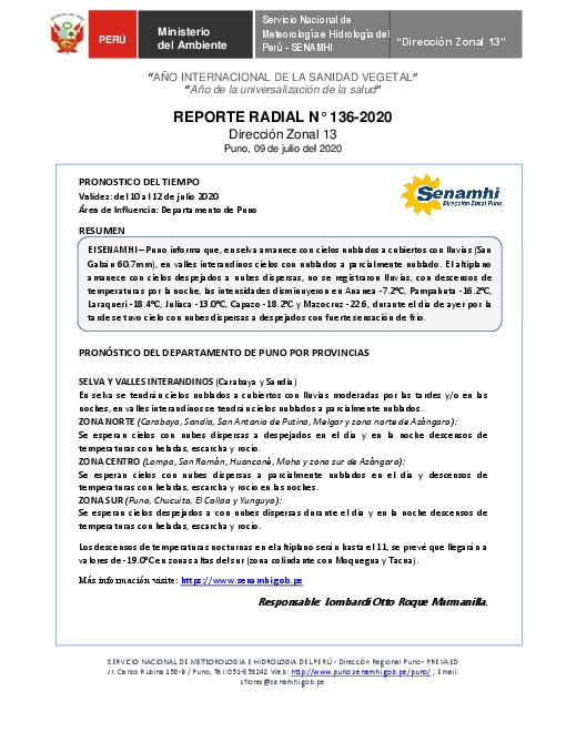 SENAMHI-DZ13 Puno: Reporte radial de 09 de julio del 2020