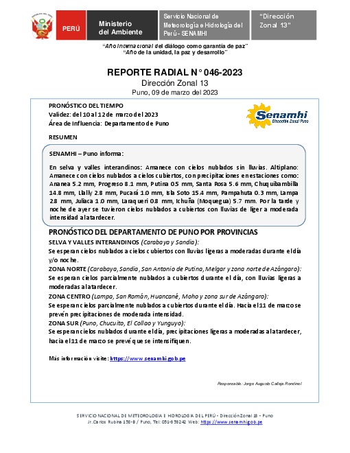 SENAMHI-DZ13 Puno: Reporte radial del 09 de marzo del 2023