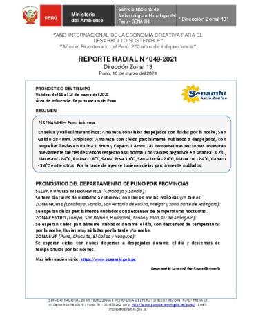 SENAMHI-DZ13 Puno: Reporte radial del 10 de marzo del 2021