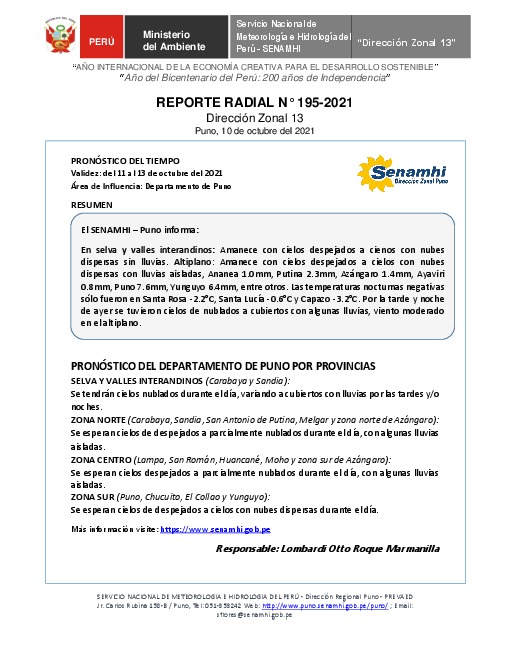 SENAMHI-DZ13 Puno: Reporte radial del 10 de octubre del 2021