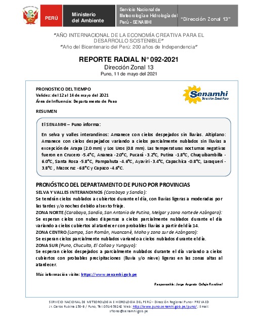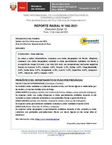 SENAMHI-DZ13 Puno: Reporte radial de 11 de mayo del 2021