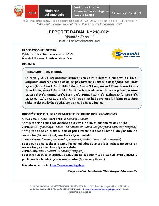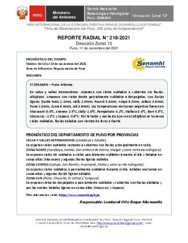 SENAMHI-DZ13 Puno: Reporte radial del 11 de noviembre del 2021