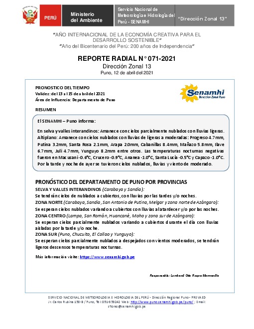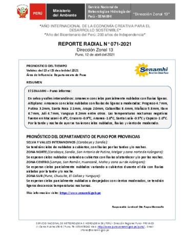 SENAMHI-DZ13 Puno: Reporte radial del 12 de abril del 2021