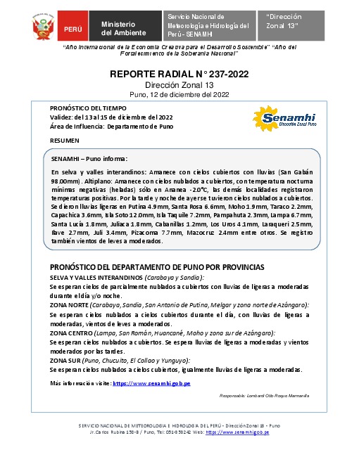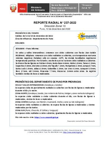 SENAMHI-DZ13 Puno: Reporte radial del 12 de diciembre del 2022