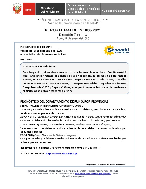 SENAMHI-DZ13 Puno: Reporte radial de 12 de enero del 2021