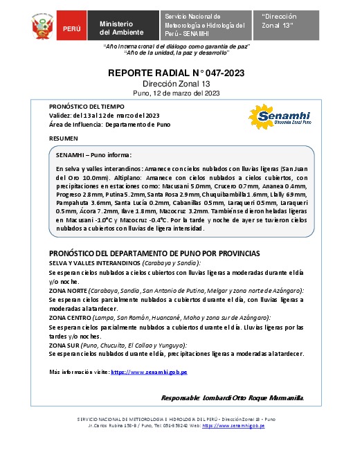 SENAMHI-DZ13 Puno: Reporte radial del 12 de marzo del 2023