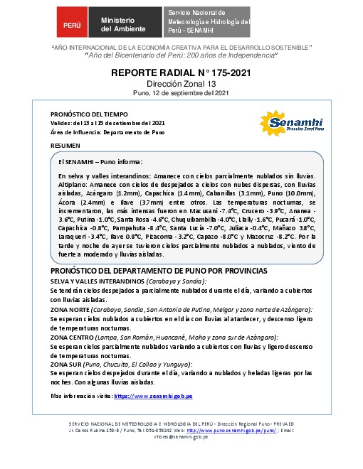SENAMHI-DZ13 Puno: Reporte radial del 12 de septiembre del 2021