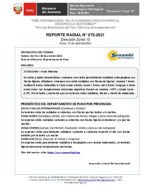SENAMHI-DZ13 Puno: Reporte radial del 13 de abril del 2021