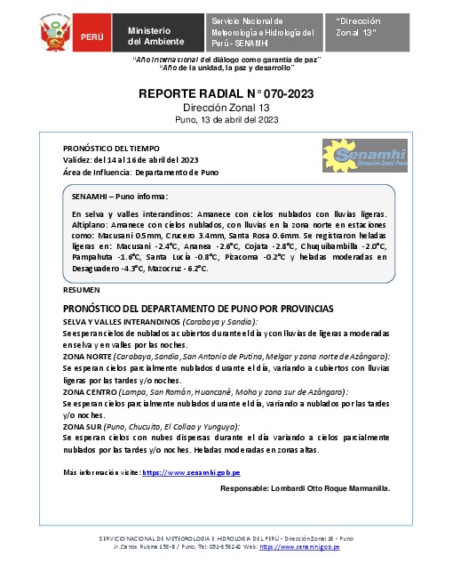 SENAMHI-DZ13 Puno: Reporte radial del 13 de abril del 2023