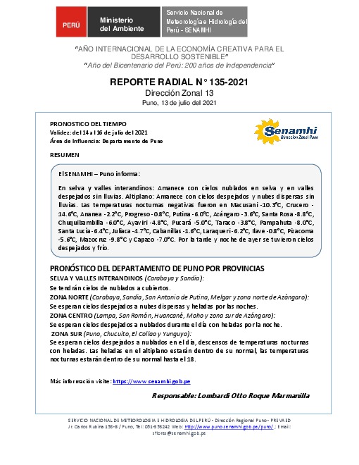 SENAMHI-DZ13 Puno: Reporte radial del 13 de julio del 2021
