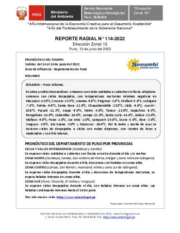 SENAMHI-DZ13 Puno: Reporte radial del 13 de junio del 2022
