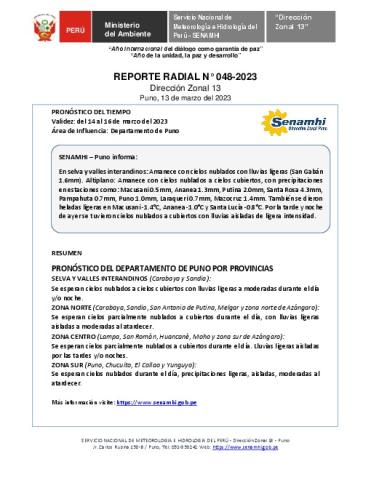 SENAMHI-DZ13 Puno: Reporte radial del 13 de marzo del 2023