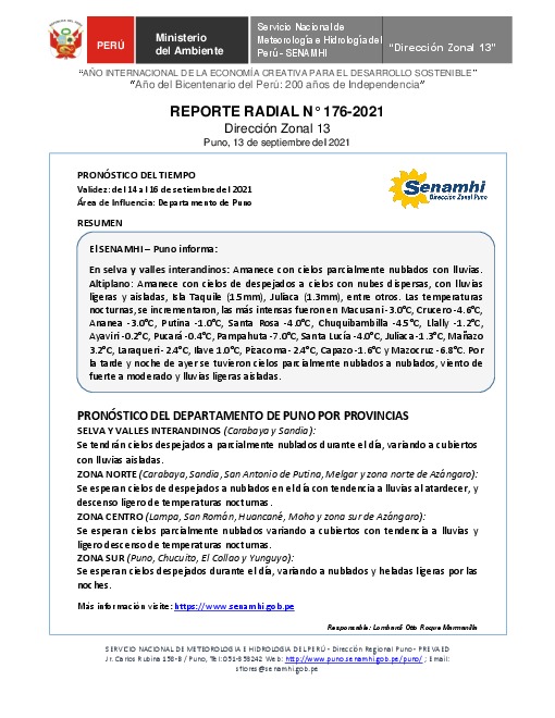 SENAMHI-DZ13 Puno: Reporte radial del 13 de septiembre del 2021