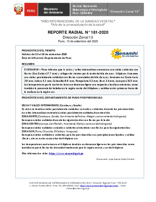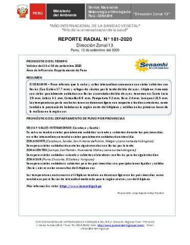 SENAMHI-DZ13 Puno: Reporte radial del 13 de setiembre del 2020